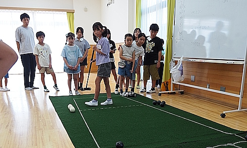 ユニカールとボッチャをしました。ユニカールはカーリングを氷のないところで行うもの、ボッチャはパラリンピックの競技のもあり、皆さんご存じのとおり、白いボールのできるだけ近くに赤、青のボールを投げ近づけるかを争います。